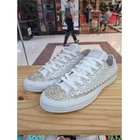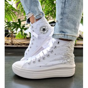 Tênis All Star Muve cano alto branco personalizado com cristais e pérolas.